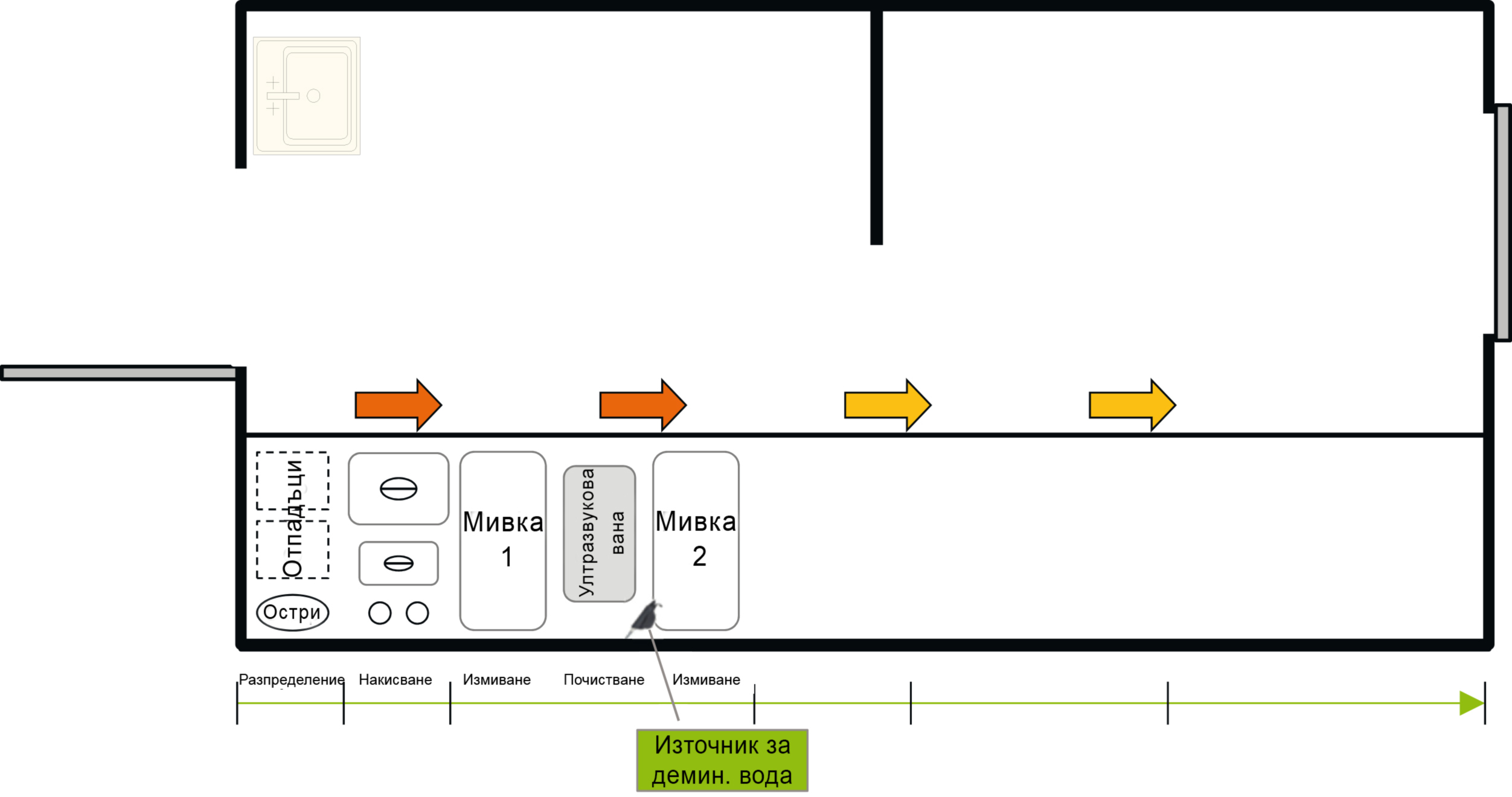 Конфигурацията на всяко работно място и апарат ще следва стъпките за обработка, например, предезинфекция, измиване, почистване, измиване, изсушаване, опаковане и стерилизация. Тази стая не трябва да се използва за други цели. Подовете и работните повърхности трябва да са гладки, избягвайки остри ъгли и ръбове, и лесни за почистване и дезинфекция.