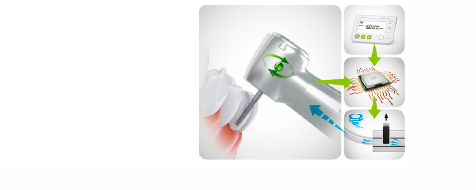 Широка гама на приложения и контролирана препарация при постоянни обороти благодарение на настройката на оборотите на борера между 60,000 и 320,000 rpm.