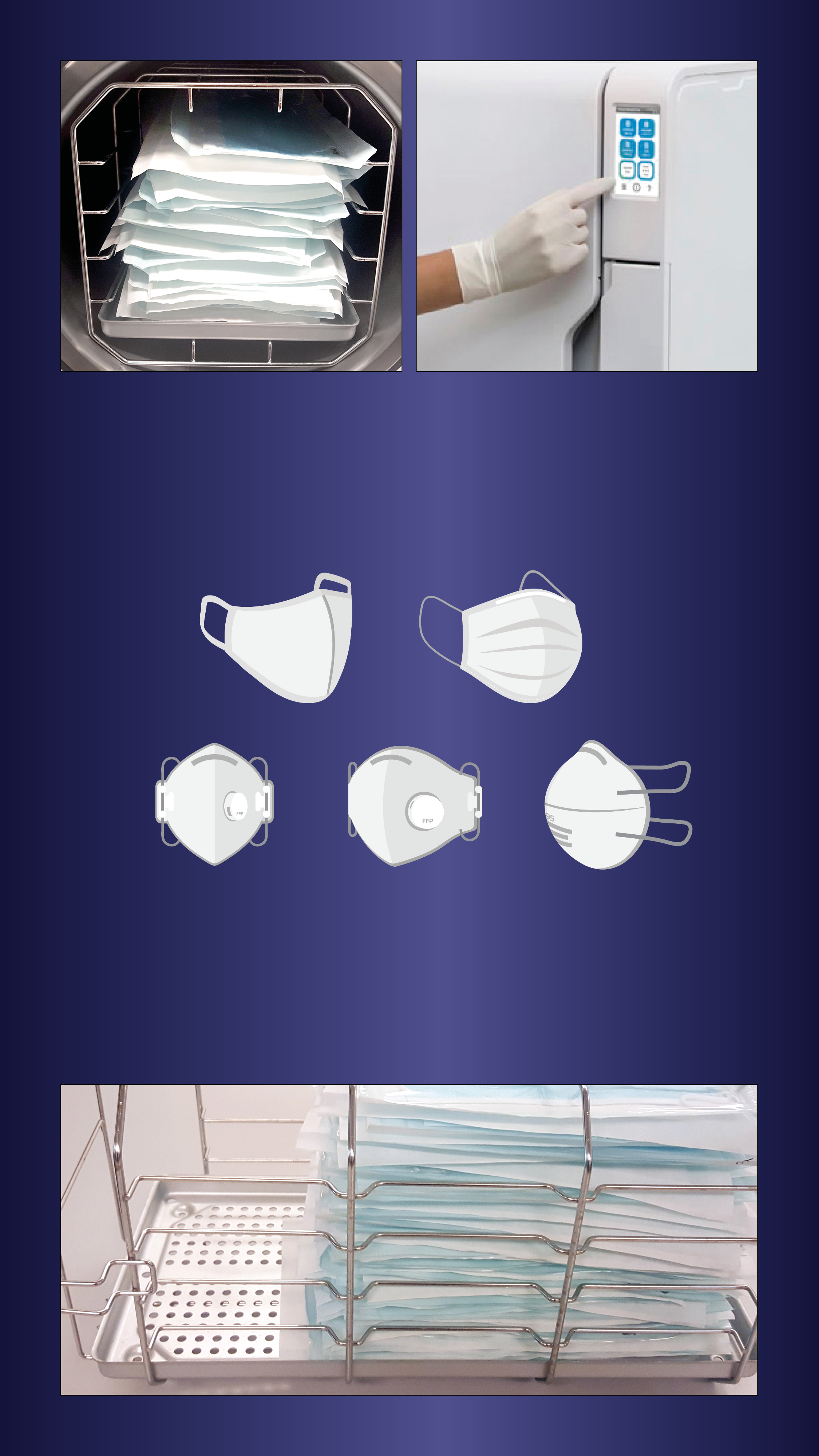 According to latest scientific recommendations and reports after reprocessing FFP2/FFP3 masks (for single use), the filter effect and respiratory capacity should be maintained during steam sterilization. We are referring to a specified steam sterilization process presented in a publication of the Delft University of Technology (2, 3), official recommendations of Austrian Authorities (1) and the Alberta Health Services (4, 5).