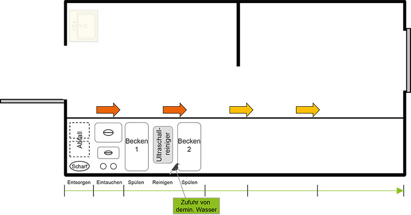 Die Anordnung der einzelnen Arbeitsbereiche und Geräte richtet sich nach der Reihenfolge der Aufbereitungsschritte, d.h. Vordesinfektion, Spülen, Reinigen, Trocknen, Verpackung und Sterilisation. Der entsprechende Raum soll nicht für andere Zwecke genutzt werden. Fußböden und Arbeitsflächen sollen glatt sein, keine scharfen Ecken und Kanten haben und leicht zu reinigen und zu desinfizieren sein.