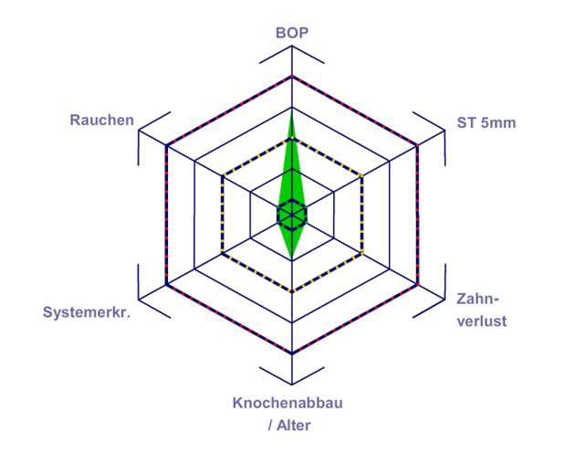 Der Patient ist 39 Jahre mit Z.n. Herzklappenersatz wegen Klappenfehlers und Endokarditis. Als Antikoagulans (Gerinnungshemmer) wird regelmäßig ASS 100 eingenommen. Aus dem Bereich Lebensstil ist die Ernährungsweise als kariesfördernd einzustufen, da mit hoher Regelmäßigkeit zuckerhaltige Lebensmittel sowie sechs bis sieben Mahlzeiten täglich verzehrt werden. Die Mundgesundheit des Patienten zeigt ein mittleres Kariesrisiko mit aktiven Läsionen. Das Parodontitisrisiko ist niedrig, es besteht eine Gingivitis. Es ergeben sich folgende Empfehlungen für die Prophylaxebehandlung.