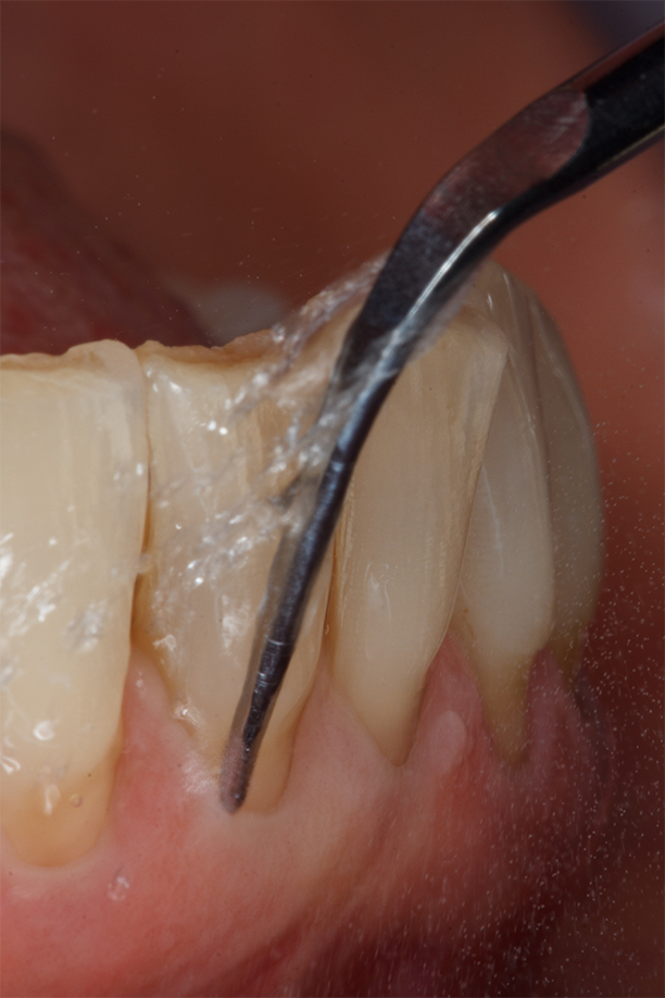 Im Anschluss an Diagnose, Information und Kommunikation werden harte und weiche Beläge sorgfältig und schonend entfernt. Dazu wird eine maschinelle und manuelle supra- und gegebenenfalls subgingivale Depuration der aktiven, tiefen Taschen durchgeführt. Hier ermöglicht die Kombination von maschinellen und manuellen Instrumenten ein optimales und vollständiges Biofilm- und Plaque-Management. Am Ende der Behandlung dient die Schlusspolitur mit einer Polierpaste der Entfernung des Biofilms und etwaiger Verfärbungen. Sie ist für mich sowohl entscheidender, immanenter Teil der Therapie, als auch ein angenehmer Behandlungsschritt für den Patienten. Das gute Mundgefühl motiviert die meisten Patienten nach dem Recall die häusliche Mundhygiene fortzuführen, und somit dazu beizutragen, ihre parodontale Situation stabil zu halten, und die Bildung von kariösen Läsionen zu verhindern.
