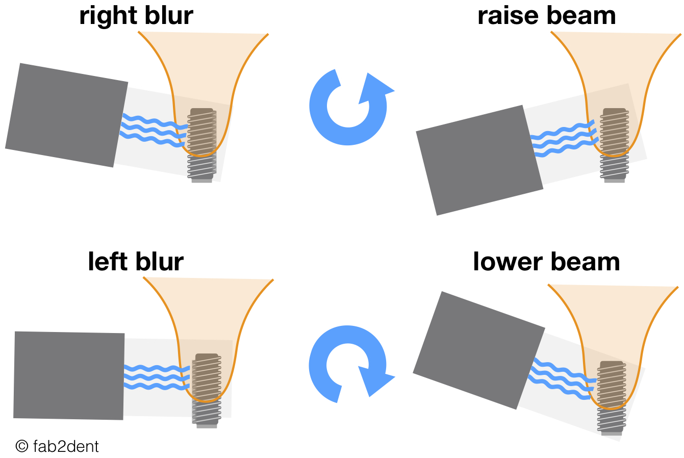 Was bedeutet das nun? Unabhängig davon ob ein Röntgenbild von einem Implantat im 1./4. oder 2./3. Quadranten angefertigt wird, wenn sich die rechte Seite des Implantates am Röntgenbild unscharf darstellt, muss der Strahlengang angehoben werden; das heißt man „zielt“ mehr nach oben, um die rechte Seite des Implantates schärfer abzubilden. Stellt sich aber die linke Seite des Implantates unscharf dar, muss man den Strahlengang senken, das heißt man „zielt“ mehr nach unten, um die linke Seite des Implantates schärfer abzubilden.