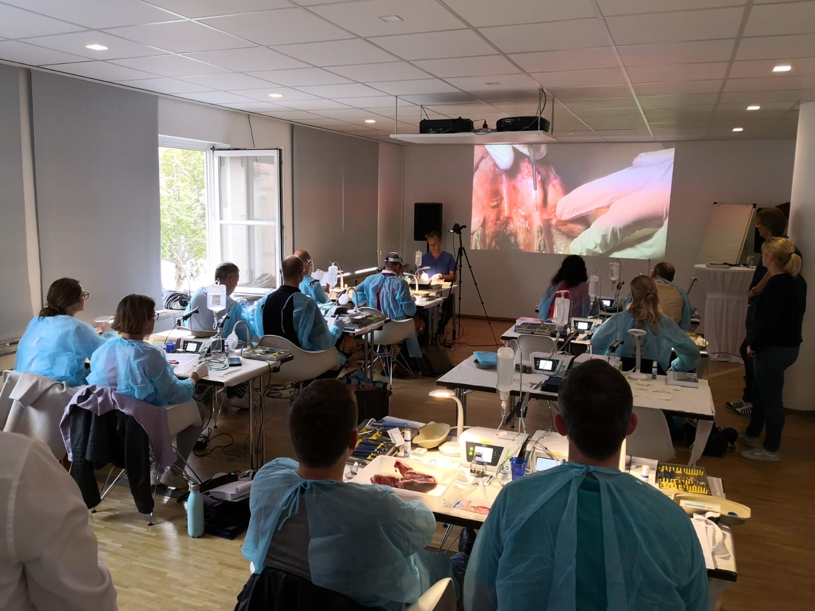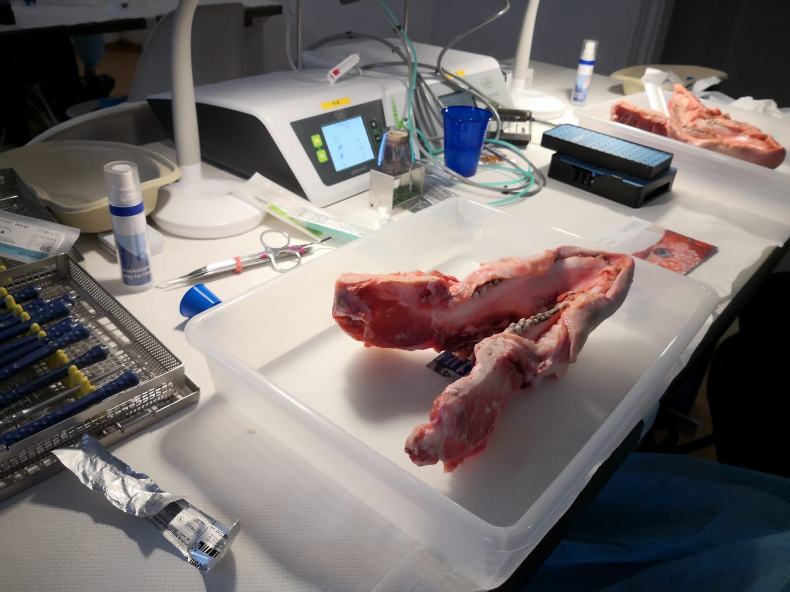 Anlass des Stuttgart-Besuchs war ein von der Firma Geistlich in der Gemeinschaftspraxis von Dr. Meschenmoser und Dr. Bittner gehaltener Kurs zum Thema ‚Komplexe Augmentation‘. Der inoffizielle Titel, den diese Veranstaltung insgeheim für mich hatte, war ‚Knochenblock reloaded 2.0‘ – schließlich waren wir doch gerade erst im Ländle und haben mit dem Blöckle gearbeitet (zum Blogbeitrag "Der Knochenjob" in Freiburg.) Zurück zur Technik, denn (B)B6 hatte vor Ort ordentlich zu tun. Nein, gemeint ist nichts aus Star Wars, sondern unsere kleine feine Piezo-Säge. Die schafft wirklich alles, danach sagt keiner mehr, Piezo sei langsam… Das Geräte-Duo Implantmed & Piezomed läuft übrigens synchron – also mit nur einer Fußsteuerung. Hier wäre jetzt Platz für Ihre Begeisterung und Applaus :-)