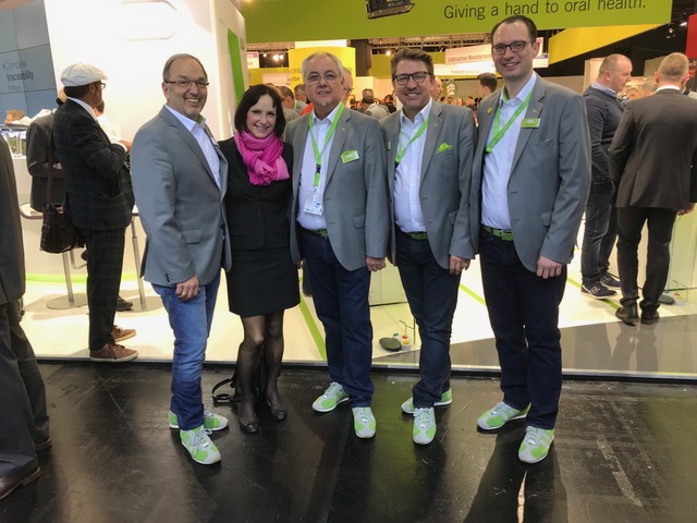 4 grüne und ein Pink Pony: Grün ist heute gar nicht politisch, aber unser TOP Outfit auf der Messe. IDS Köln und hoher Besuch von Verlegerin MS. Ein Rundgang auf dem Stand und die Vorführung der neuesten Produkt-Innovationen inklusive. Ein schönes Abschlussfoto, v.l.n.r. Peter Malata, Marianne Steinbeck, Andreas Lette, Christian Kurz und Michael Pointner.