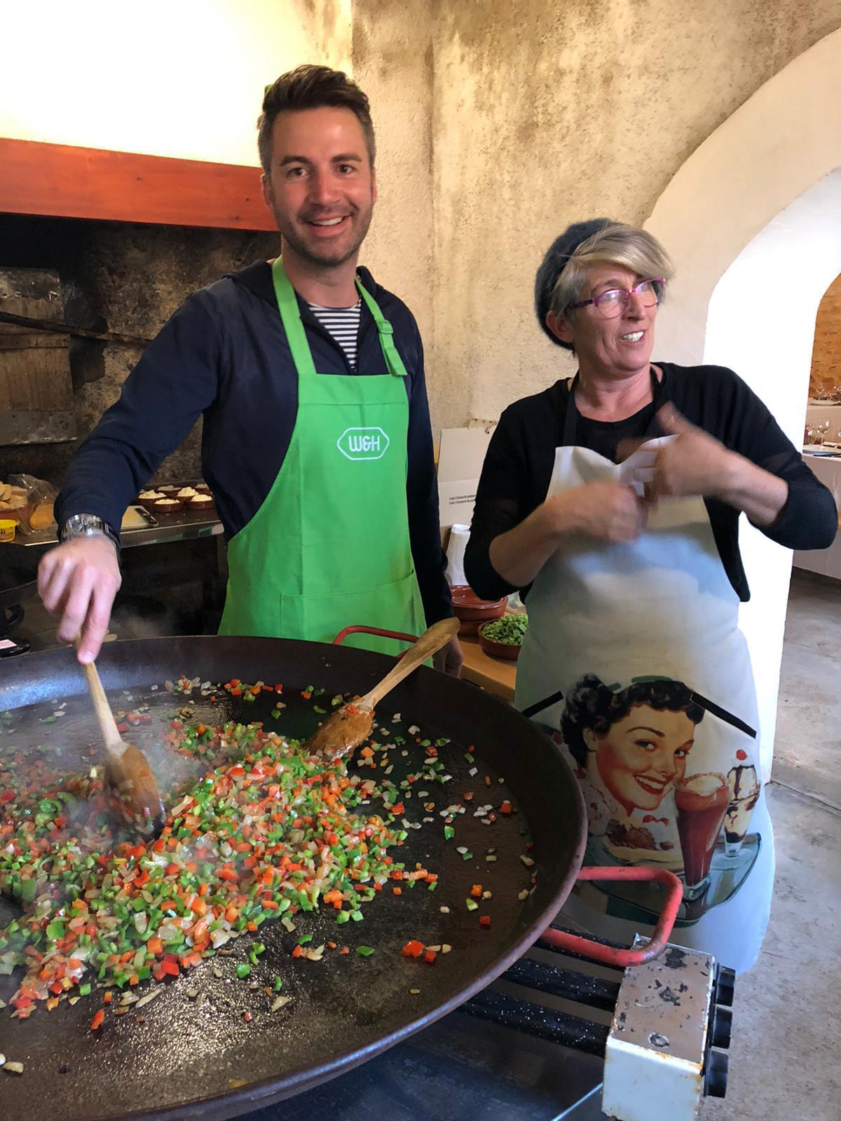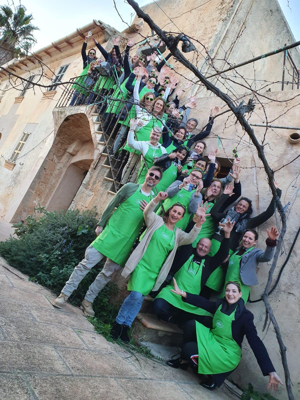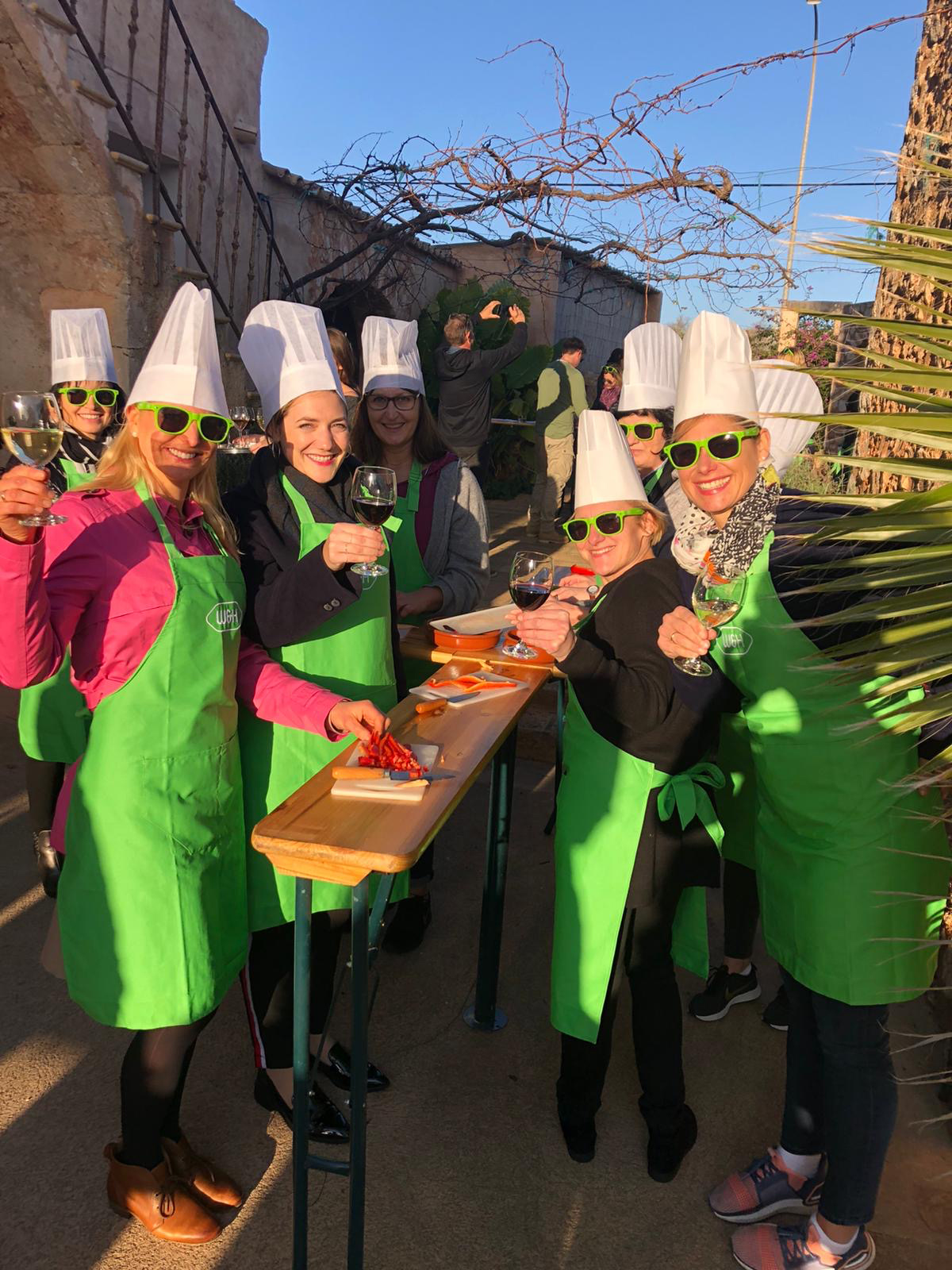 Kulinarisch ging es auf Malle noch ordentlich weiter, denn W&H lud zum großen Paella-Kochen. Und damit sich auch keiner bekleckert, hatte Roland fesche grüne Schürzen im Gepäck. Diese wurden zu späterer Stunde wieder ausgezogen, denn jetzt standen alle Zeichen auf „Silence Party“. Noch nie gehört? Dann unbedingt mal machen! Dabei handelt es sich um eine Party-Variante, bei der jeder Teilnehmer die Musik ausschließlich über Kopfhörer eingespielt bekommt. Tanzen in der Stille – dem Roli hats gefallen und ich freue mich, dass er so einen schönen Start in seinen Geburtstag hatte.