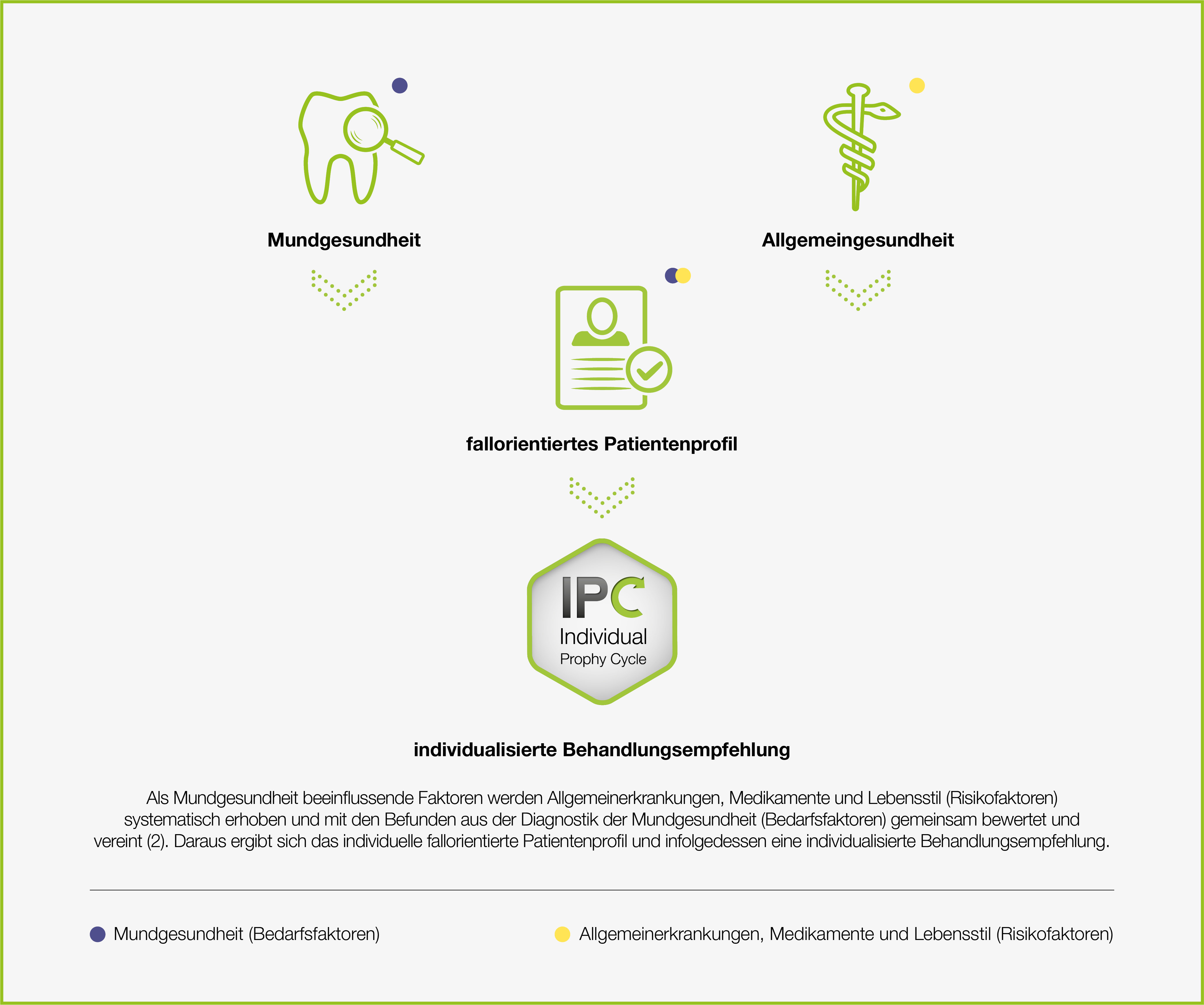 - Bedarfsgerechte Behandlung gemäß Mundgesundheitszustand unter Berücksichtigung zahnmedizinisch relevanter Faktoren der Allgemeingesundheit