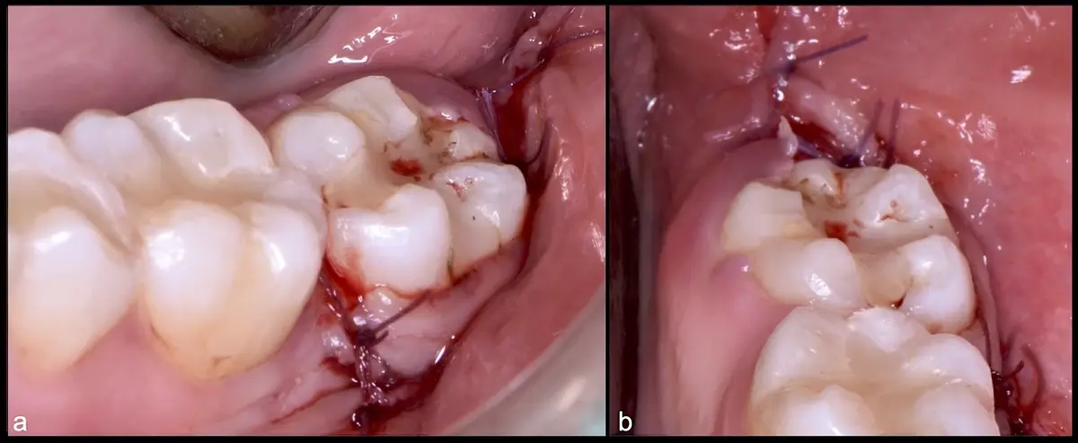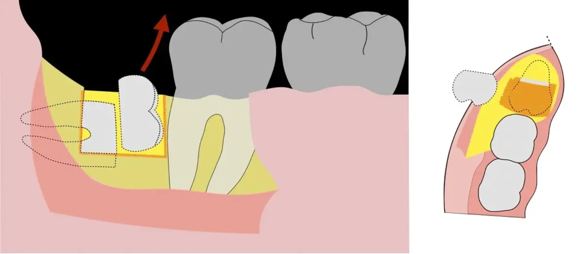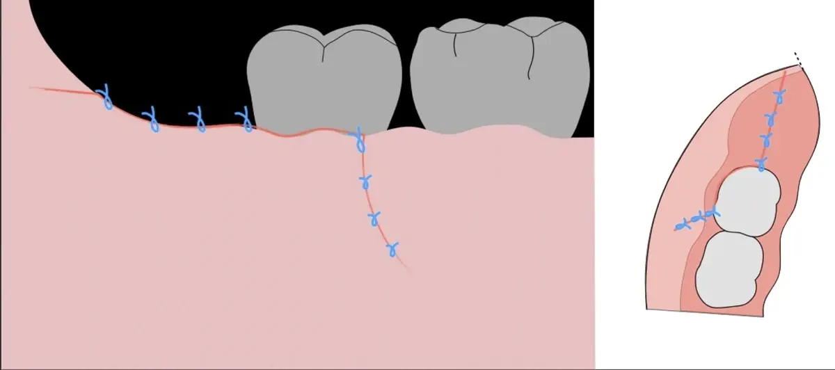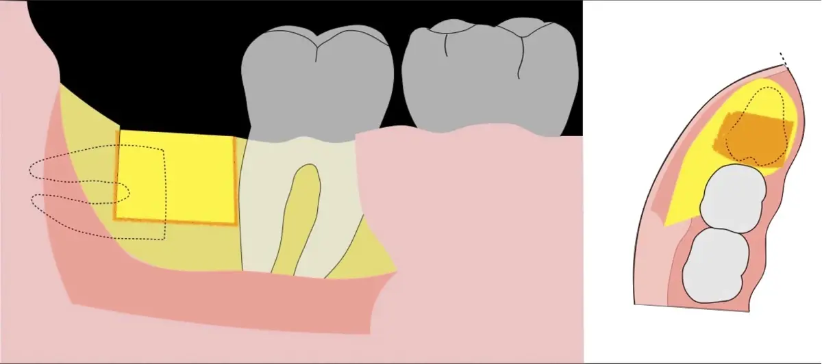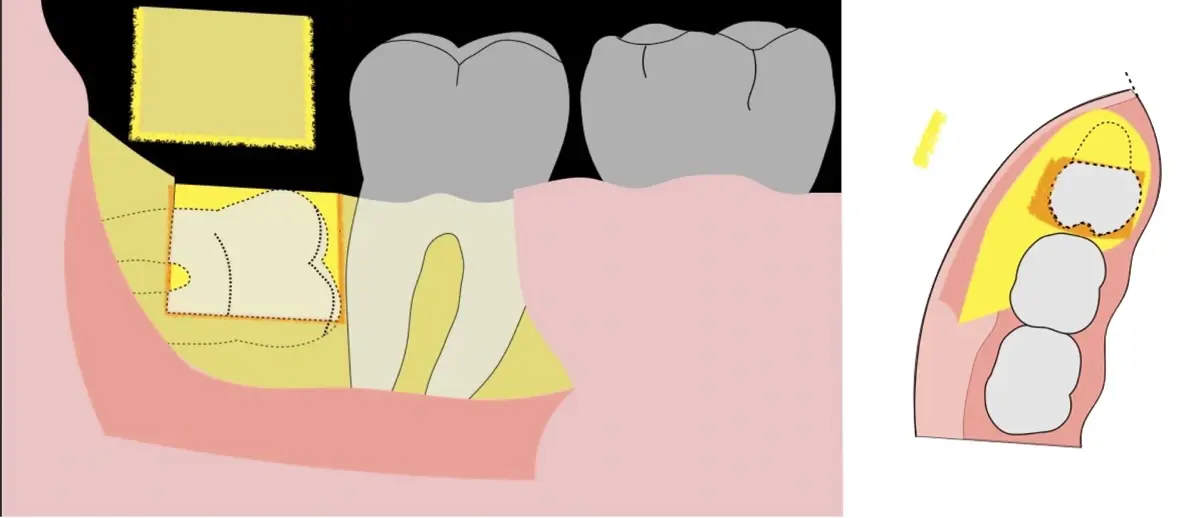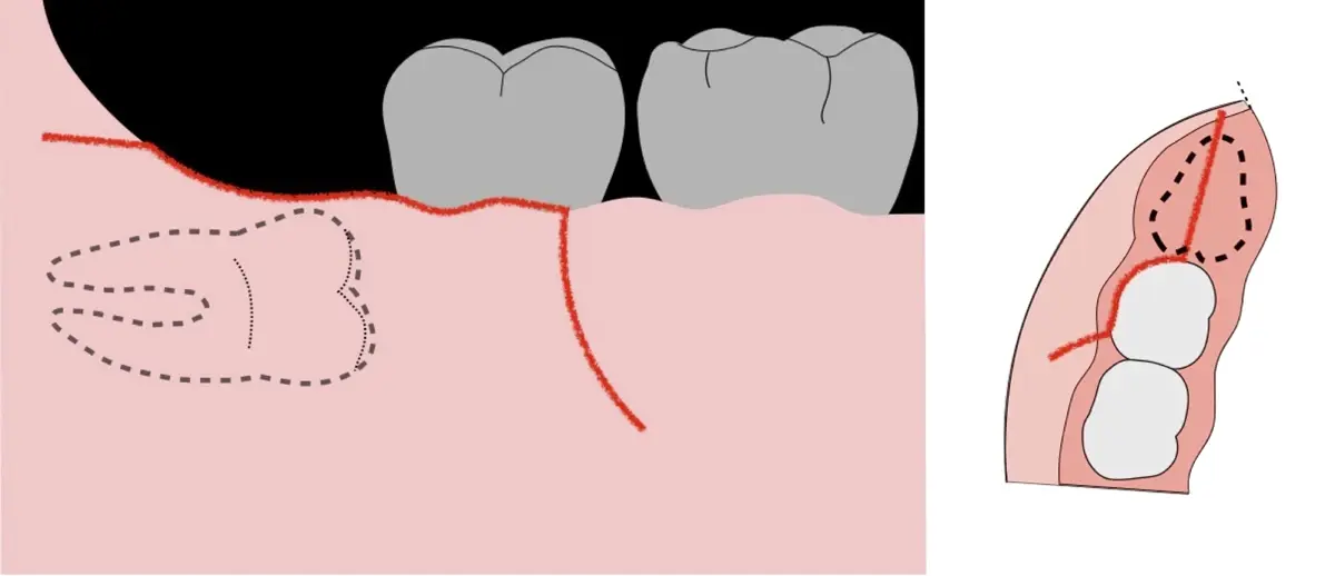 El procedimiento se inicia colocando anestesia troncular para bloqueo del nervio dentario inferior y sus ramas. Luego, se establecerá el diseño de acceso según la disposición de la molar a extraer. Para fines didácticos, se explicará cómo se realizaría la extracción de la molar de la Figura 1: se realiza una incisión horizontal a nivel de la zona retromolar hasta llegar a distal de la segunda molar, continuándose con una incisión intrasurcular hasta mesial de la segunda molar, finalizando con una incisión vertical a espesor total hasta llegar a la línea mucogingival (Figura 2).