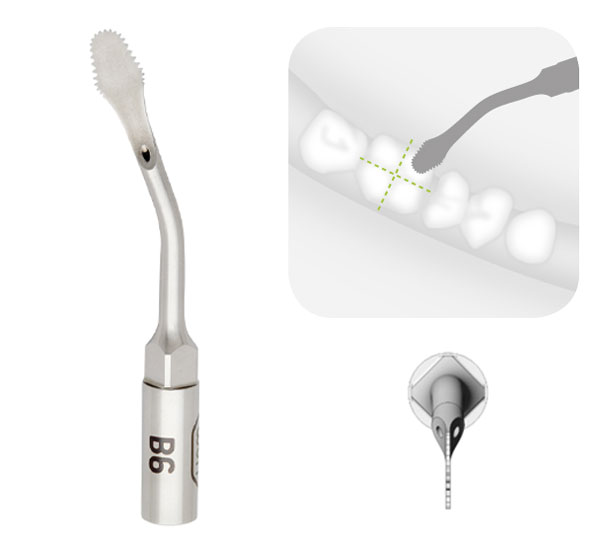 - B2R, B2L - Inserto con engranaje fijo para los cortes de sierra horizontal, con poca pérdida ósea en zonas de difícil acceso. Disponible curvado hacia la derecha o hacia la izquierda.