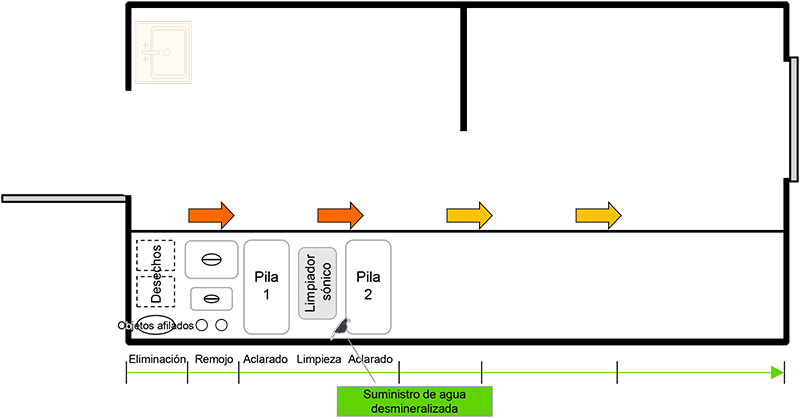 La configuración de cada área de trabajo y de cada dispositivo debe seguir los pasos de reprocesamiento, es decir, desinfección previa, aclarado, limpieza, aclarado, secado, envasado y esterilización. Esta sala no se utilizará para ningún otro propósito. Los suelos y las superficies de trabajo deben ser suaves y lisas, sin esquinas o bordes afilados y, además, tienen que poder limpiarse y desinfectarse con facilidad.