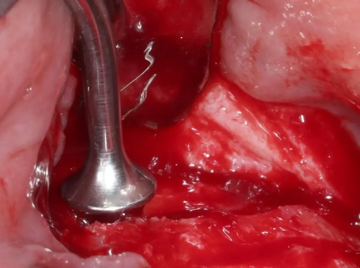 Una vez elevado el piso sinusal según la planificación se realiza la evaluación clínica de la integridad de la membrana y de posibles desgarros a través de la maniobra de Valsalva.24 Consiste en pedir al paciente que respire profundamente y retenga el aire, cerrar la boca, apretar la nariz con los dedos y forzar la salida de aire. Al final de la prueba, es necesario mantener la presión entre 10 a 15 segundos. Se identificará la movilidad de la membrana y la ausencia de burbujas de aire para corroborar que no hay perforaciones. Dependiendo de la decisión clínica se puede optar por adicionar en la superficie de la membrana de Schneider membranas de colágeno o de plasma rico en fibrina (PRF) para dar mayor soporte durante la inserción del biomaterial de relleno óseo (Figura 10).