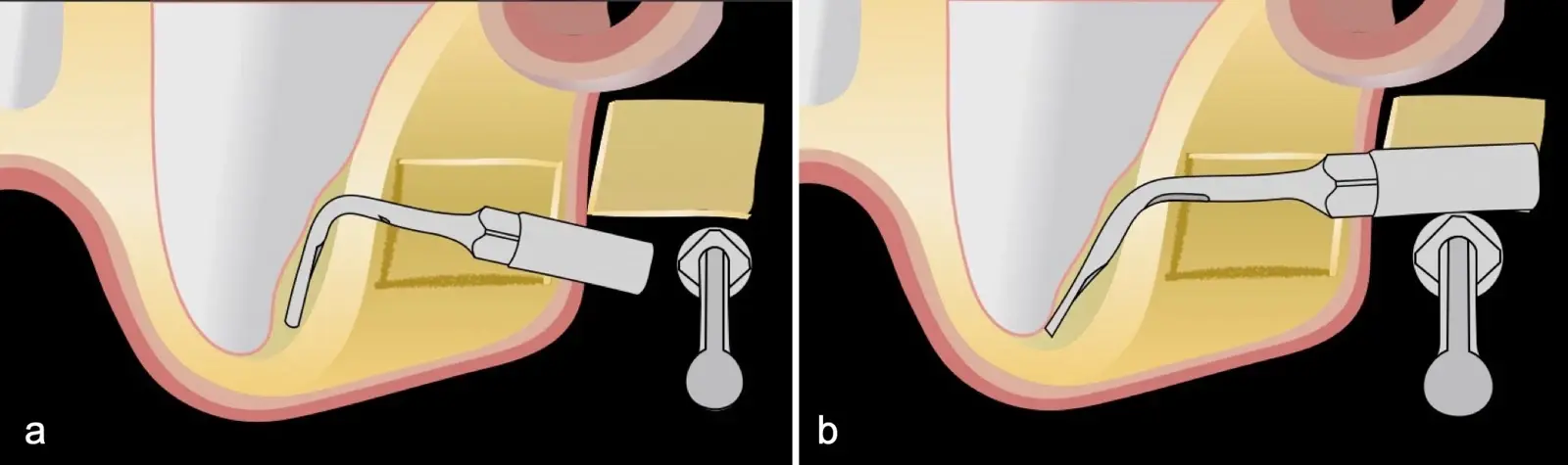 Se inicia la elevación de la membrana de Schneider con el inserto redondeado no cortante en forma de disco, empleando movimientos suaves. El levantamiento puede complementarse con elevadores convencionales, siguiendo la dirección mesiodistal. La fase de desprendimiento inicia con el piso y sigue hacia la pared mesial para terminar, y de ser necesario, hacia la pared posterior. Existen diversos insertos con angulaciones y longitudes para mayor accesibilidad16 (Figura 1).