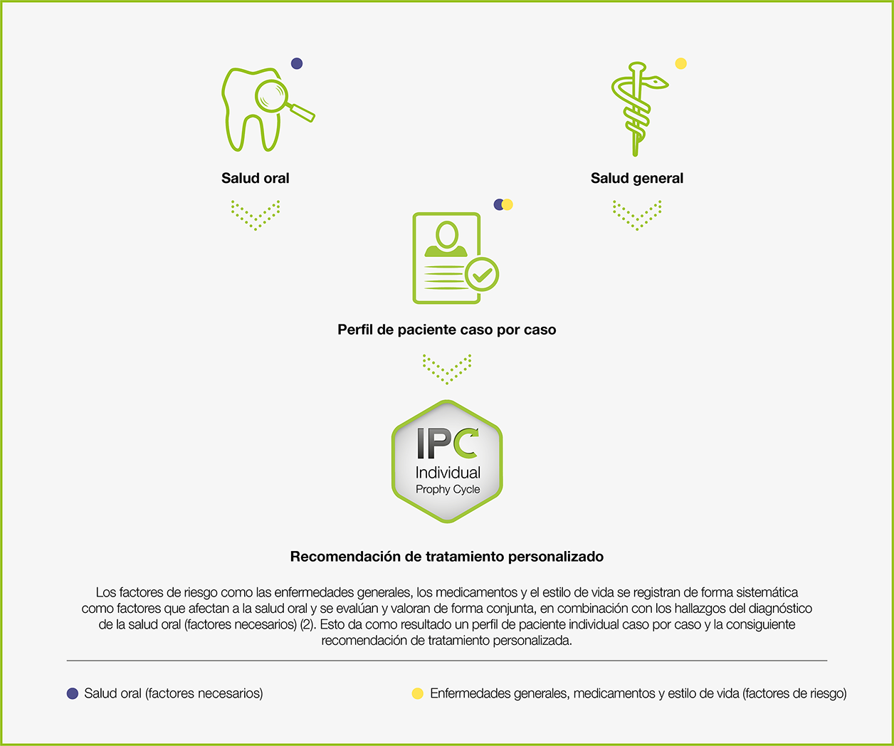 Recomendación de tratamiento personalizadoEl objetivo del perfil de paciente es una recomendación de tratamiento personalizado para aumentar la seguridad del tratamiento y hacer que la terapia sea más eficiente (2). El historial médico del paciente y el diagnóstico de la salud oral, por ejemplo, el diagnóstico de caries, el diagnóstico periodontal y otros diagnósticos, forman la base del tratamiento y las medidas preventivas para la salud oral (1, 3). Para desarrollar un perfil de paciente individual caso por caso, ahora hay nuevos factores de la salud general que influyen en la salud oral. La influencia en la salud oral (4) se evalúa de acuerdo con eso y se incluye en la consiguiente recomendación de tratamiento personalizado. Para ayudar en esta evaluación, se ha desarrollado una hoja de historial médico.