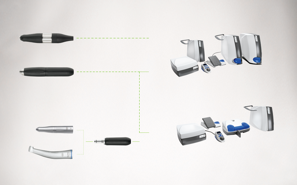 Con il manipolo tecnico 945 è possibile eseguire rapidamente e in modo efficiente interventi di correzione, adattamento e finitura di protesi dentarie amovibili e fisse (prima della cementazione), epitesi, portaimpronte individuali e apparecchi di regolazione ortodontici, direttamente alla poltrona