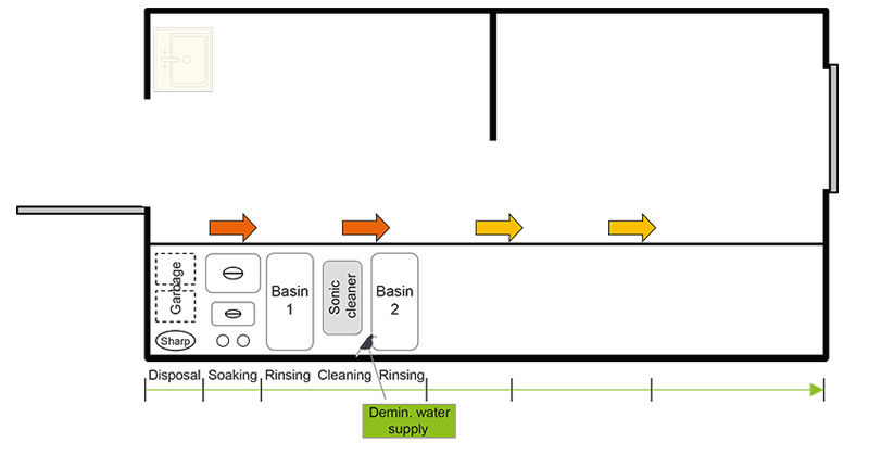 The first fundamental principal is to foresee two (virtual) areas in the room; a dirty and a clean zone. Rationally, instruments will travel in one direction from the dirty zone towards the clean zone. As a consequence of this one-way flow, processed (clean) instruments shall not enter the dirty zone; hence the reprocessing area should ideally be rectangular, a kind of pass-through corridor, featuring two doors (IN & OUT). Both areas require ventilation and the air flow must stream from the clean zone to the dirty zone to prevent potentially contaminated air from the dirty zone being circulated in the clean zone. This can be achieved by pressurizing the clean area or exhausting the dirty area.